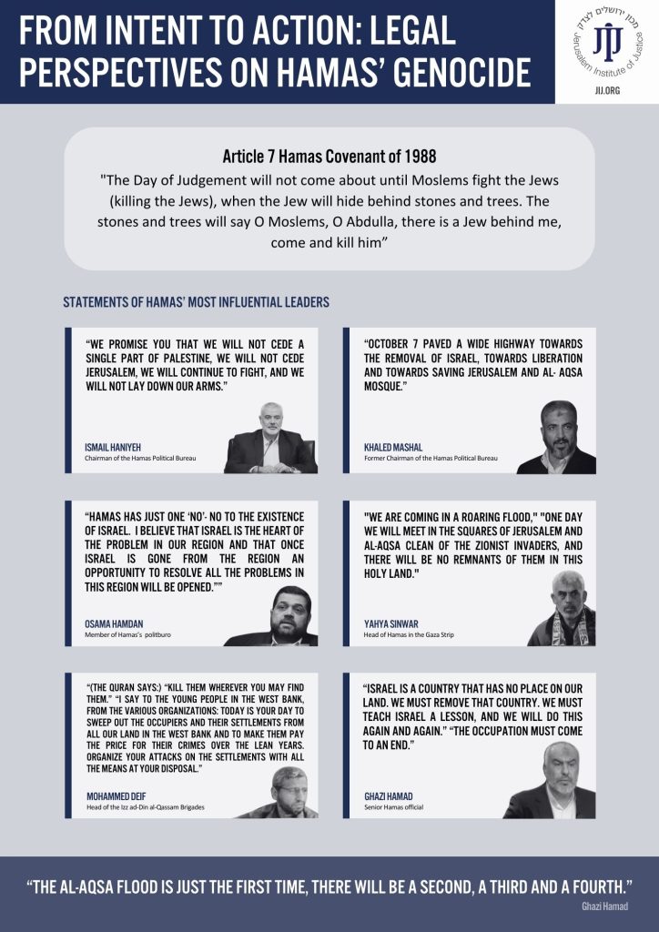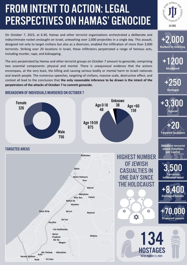 The acts perpetrated by Hamas and other terrorist groups on October 7 amount to genocide, comprising two essential components: physical and mental. There is unequivocal evidence that the actions encompass, at the very least, the killing and causing serious bodily or mental harm to Israeli nationals and Jewish people. The numerous speeches, targeting of civilians, massive scale, destructive effect, and context all lead to the conclusion that the only reasonable inference to be drawn is the intent of the perpetrators of the attacks of October 7 to commit genocide.