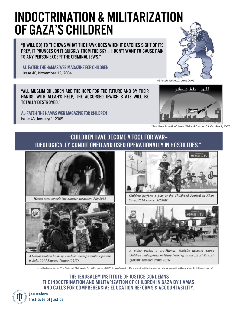 Through educational institutions, media, summer camps, and direct involvement in military operations, Hamas has created an environment where children are psychologically conditioned, trained, and, in many cases, recruited for armed conflict. These practices constitute grave violations of international humanitarian law (IHL), international criminal law (ICL), and international human rights law (IHRL). JIJ condemns the indoctrination and militarization of children by Hamas and calls for comprehensive education reforms and accountability. Download factsheet here.