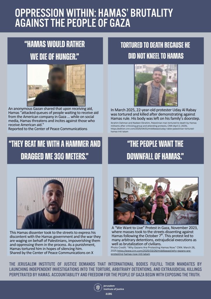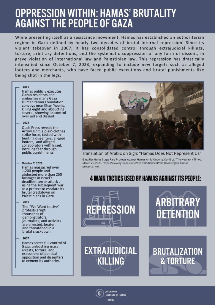 Hamas maintains control over Gaza through a pattern of violence and intimidation. Our fact sheet highlights how the group has escalated its repression since October 7, 2023, meeting the legal criteria for both war crimes and crimes against humanity. Findings include: